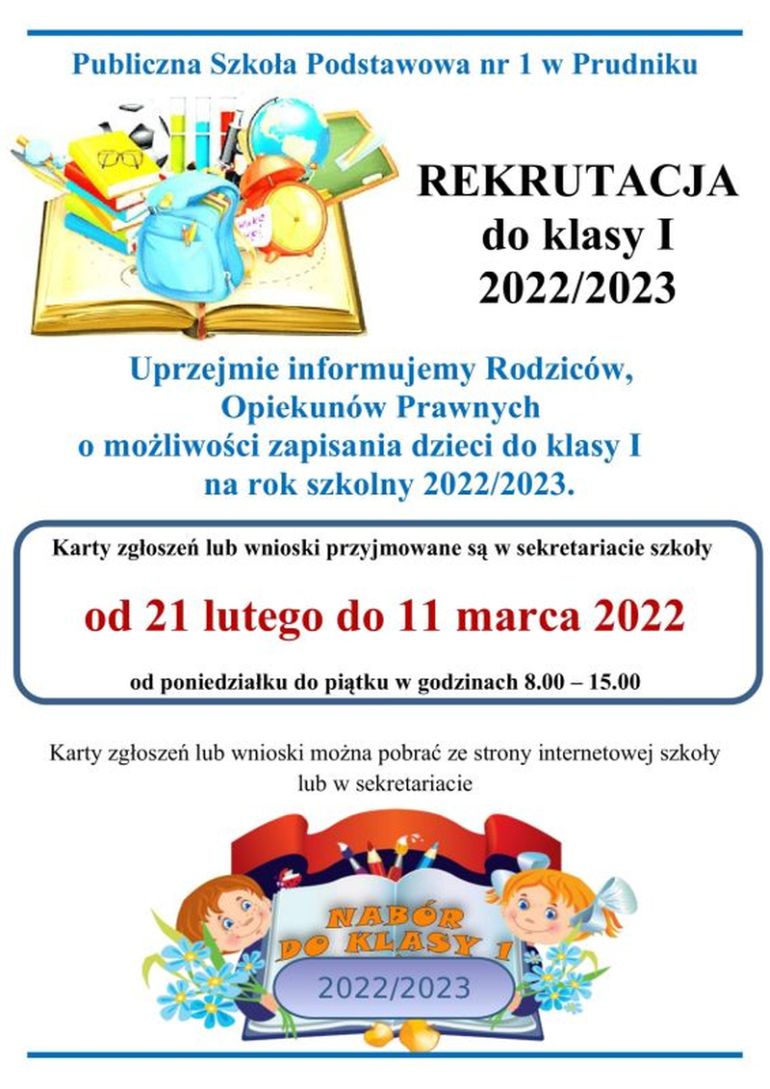 Na podstawie ustawy z dnia 14 grudnia 2016 r. Prawo oświatowe (Dz. U. z 2020 r. poz. 910 i 1378 ze zm.) informuję, że zgłoszenia dzieci do klasy I w roku szkolnym 2022/2023 urodzonych w roku 2015 i zamieszkałych w obwodzie Publicznej Szkoły Podstawowej Nr 1 im. Bohaterów Westerplatte w Prudniku należy składać w terminie od 21 lutego do 11 marca 2022 r. w sekretariacie szkoły lub elektronicznie (przesłać skan zgłoszenia). Należy również poinformować szkołę, jeżeli dziecko będzie realizowało obowiązek szkolny w innej placówce.